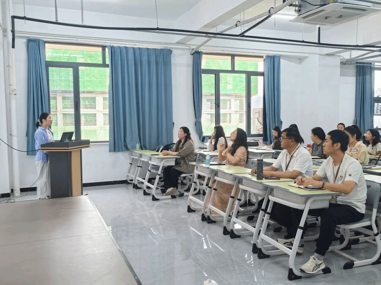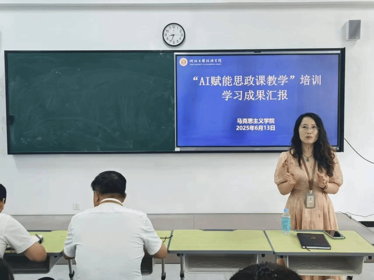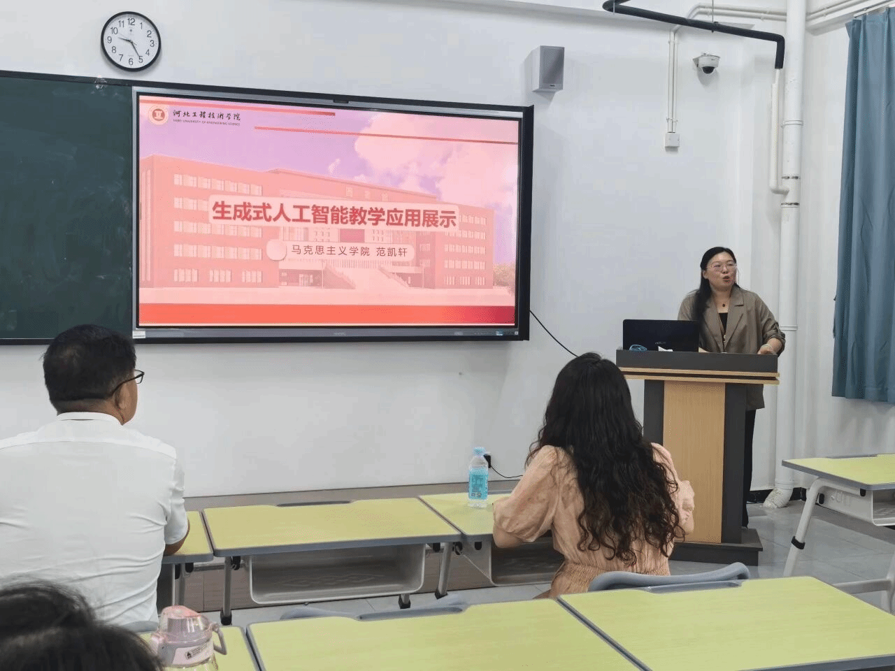 近日,马克思主义学院梁印林、范凯轩在8号楼407教室进行AI赋能思政课教学”培训学习成果汇报,分享思政课教师应用生成式AI的技术和思路。本次活动由马克思主义学院党支部书记、副院长李洁主持。