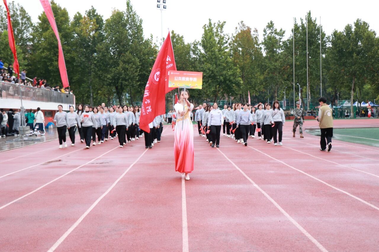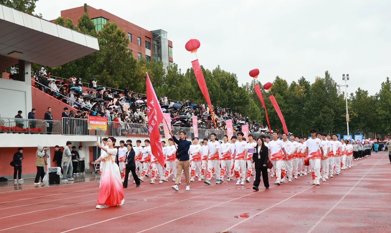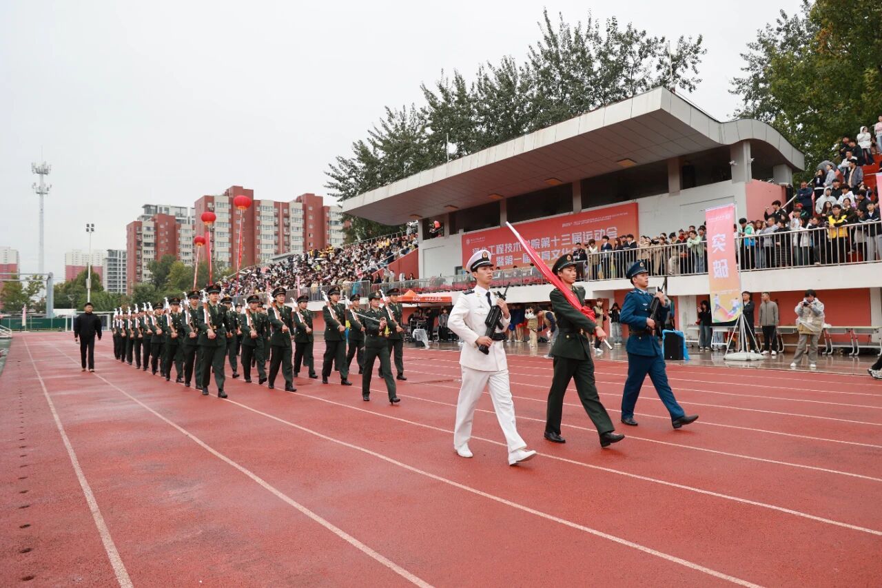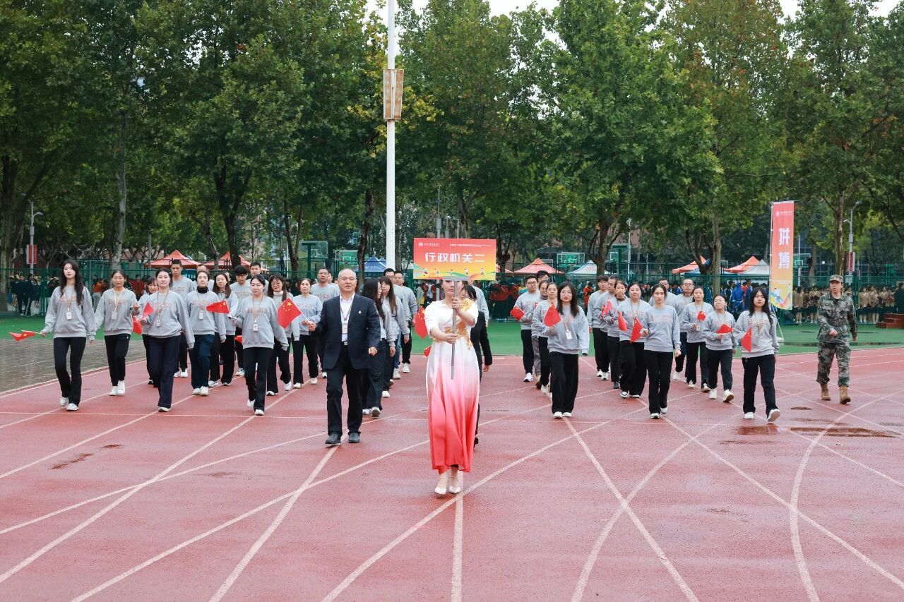 开幕式在激昂的《运动员进行曲》中正式开始。国旗护卫队率先入场,他们步伐铿锵,身姿挺拔,目光如炬,展现了我校国旗队庄严威武的气势。紧随其后的是校旗方阵与各学院运动员代表方阵,他们精神抖擞、意气风发,以掷地有声的口号和各具专业特色的表演,展现了河工人昂扬进取的精神风貌。由学校教职工代表组成的教职工方队步伐沉稳、神采奕奕,展现了新时代教育工作者笃行不怠的使命担当与育人风采。
