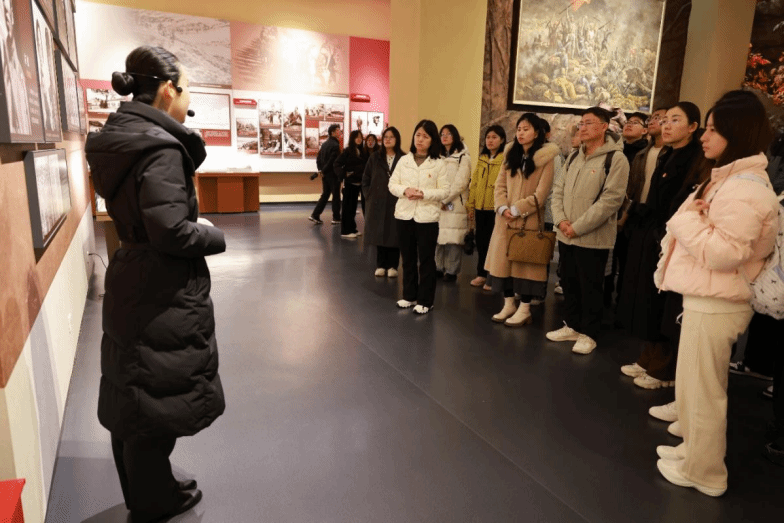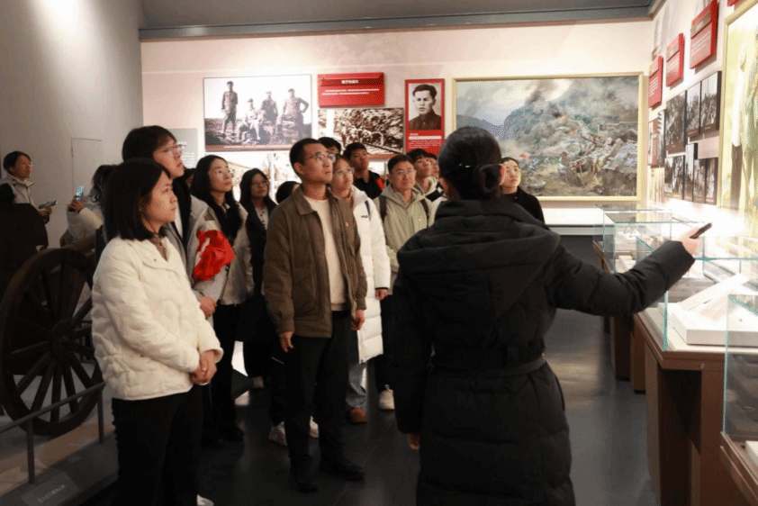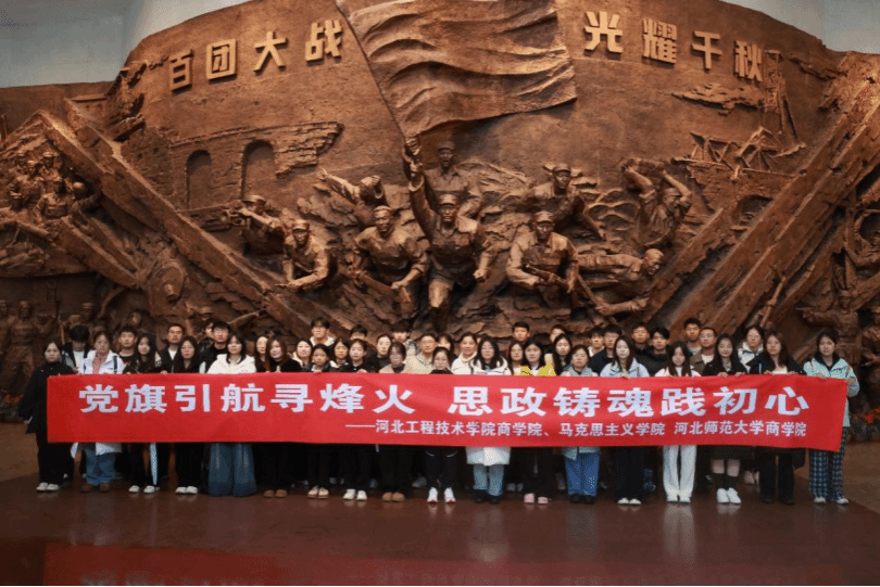 为缅怀革命先烈、回顾百团大战光辉历程、弘扬伟大抗战精神,进一步筑牢党员历史使命感与责任感,坚定理想信念、锤炼党性修养,11 月 7 日,我校商学院、马克思主义学院联合河北师范大学商学院,赴百团大战纪念馆共同开展 “党旗引航寻烽火,思政铸魂践初心” 主题实践活动。商学院院长王明吉,党总支书记、学管副院长刘茜,思政教研室主任陈赤华、河北师范大学李伟柳等 49 名师生党员代表共同参与此次活动。