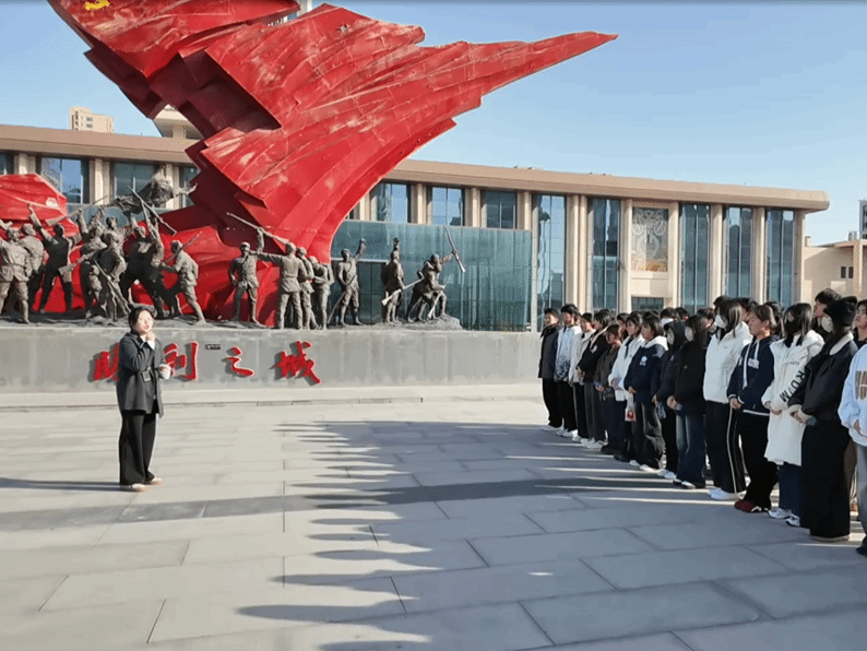 在解放广场上,师生驻足于“胜利之城”雕塑前。网络空间安全学院思政教研室主任范凯轩通过雕塑中不同着装战士的形象,讲述了在1947年解放石家庄战役中解放军协同作战的光辉历史,生动还原了六天六夜鏖战的血色黎明。朱德总司令的“石门封锁太行山,勇士掀开指顾间”,不仅是对胜利的礼赞,更是对后人的激励。昔日的“石门”需用炮火与热血去“掀开”,而今天的“数字之门”则需用智慧与技术去守护。